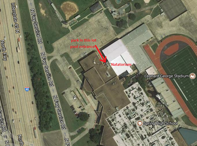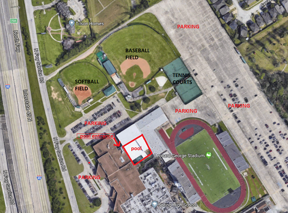 On evenings when there is a football game or other big event at Spring High School, the main parking lot may be full. There is additional parking behind the baseball field and the tennis courts. You can access these parking areas by taking the small road north of the softball field. Also, sometimes the gate is open next to the building and you can drive along the side of the building to get to the back parking lots.